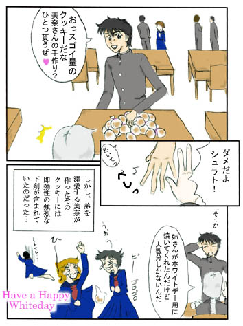 ホワイトデー記念 (2005.03.14) バレンタインからの続き。 続きなら本当は、「ガイにお礼をするシュラト」を描かなくちゃですが シュラトがお礼とかに気を回すとは到底思えなくて。 また、G様の「下剤作用のある美奈オリジナル毒薬」という設定が ツボにガッツリはまりました。 もうきっと一生忘れられないです!(大笑)